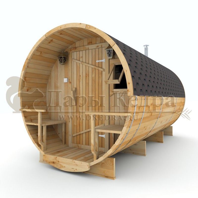 Баня-бочка буханка из кедра с верандой (все размеры) Баня-буханка более просторная за счет увеличенной высоты потолков и ровного пола. На веранде можно оставить вещи или отдохнуть после процедур парения. Лавочки из кедра находятся по всей длине бани-бочки с обеих сторон. Печь расположена в парилке около дальней стены. Время растопки такой бани не превышает 30 минут. В зависимости от выбранного размера баня-бочка буханка с верандой имеет следующую комплектацию: Баня-бочка буханка 2,5 метра - парилка; Баня-бочка буханка 3,5 и 4,5 метра - раздевалка, парилка; Баня-бочка буханка 5,5 метров - раздевалка, парилка, моечная. По вашему желанию ее можно укомплектовать печью с внешней загрузкой, благодаря которой весь мусор вовремя топки остается на улице. Баня-бочка буханка не требует полноценный фундамент, поэтому при необходимости ее можно перенести в другое место. Обращаем Ваше внимание, что в стандартную комплектацию бани входят полки открытого типа в парной с обеих сторон. Дополнительно можно заказать полок закрытого типа или лавку! Кедр обладает ароматическими свойствами. Он не деформируется и влагоустойчив, при правильном уходе за деревом на нем не развиваются грибки и плесень.