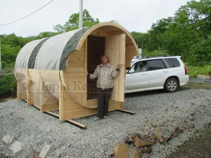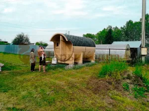 Это изделие круглой вытянутой формы. Козырек не только украшает баню, но и защищает оставленную обувь от дождя. Лавочки из кедра находятся по всей длине бани-бочки с обеих сторон. Печь расположена в парилке около дальней стены. Время растопки такой печи не превышает 30 минут. В зависимости от выбранного размера круглая баня-бочка с козырьком имеет следующую комплектацию: