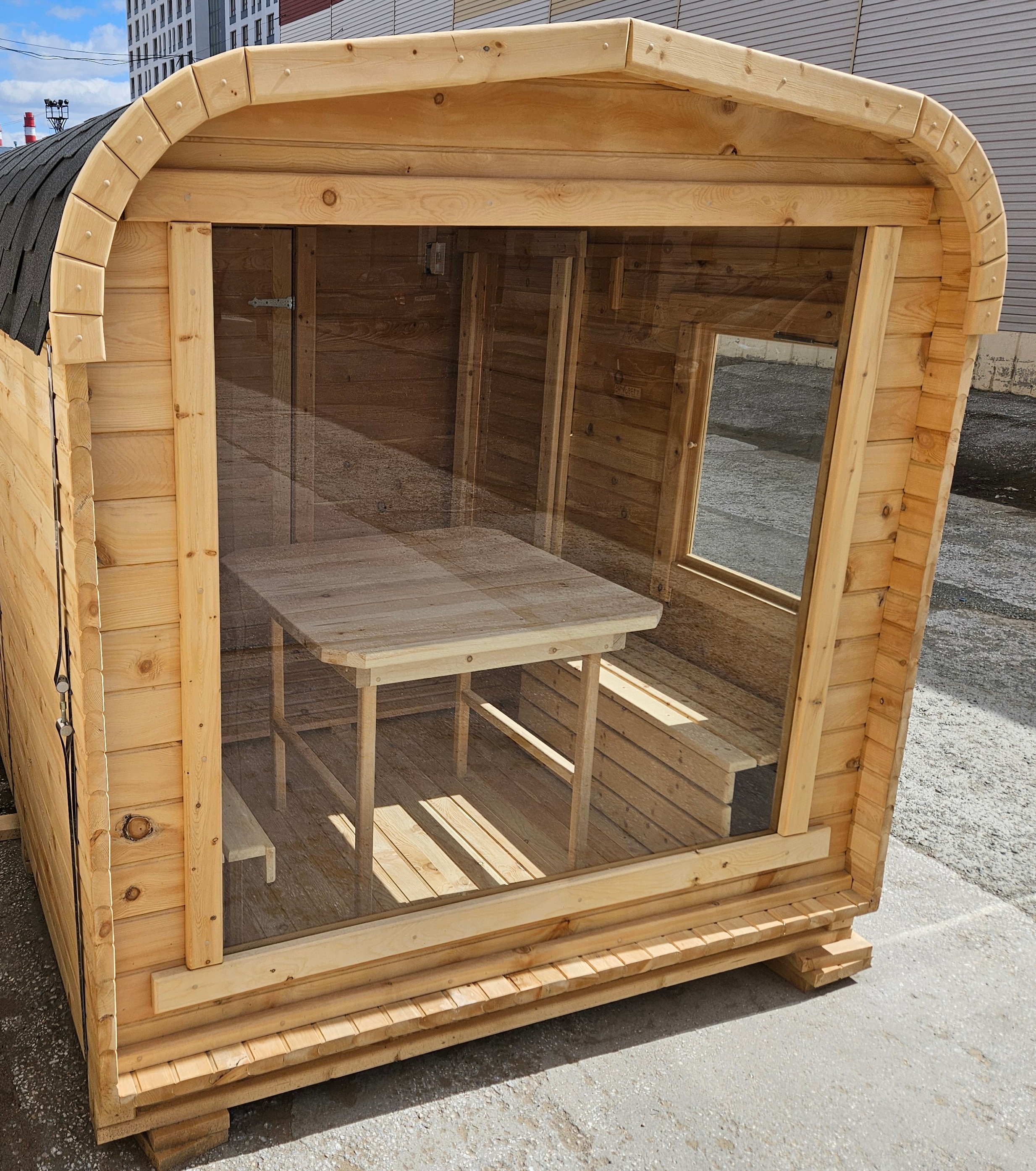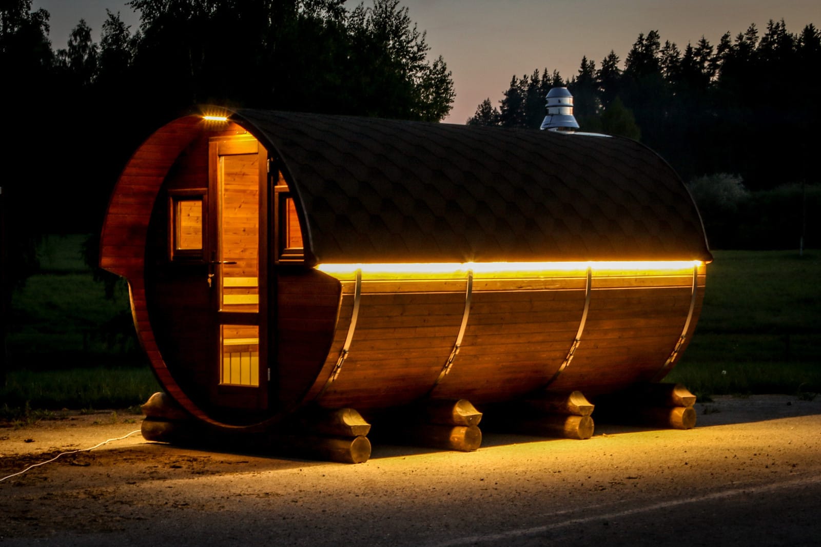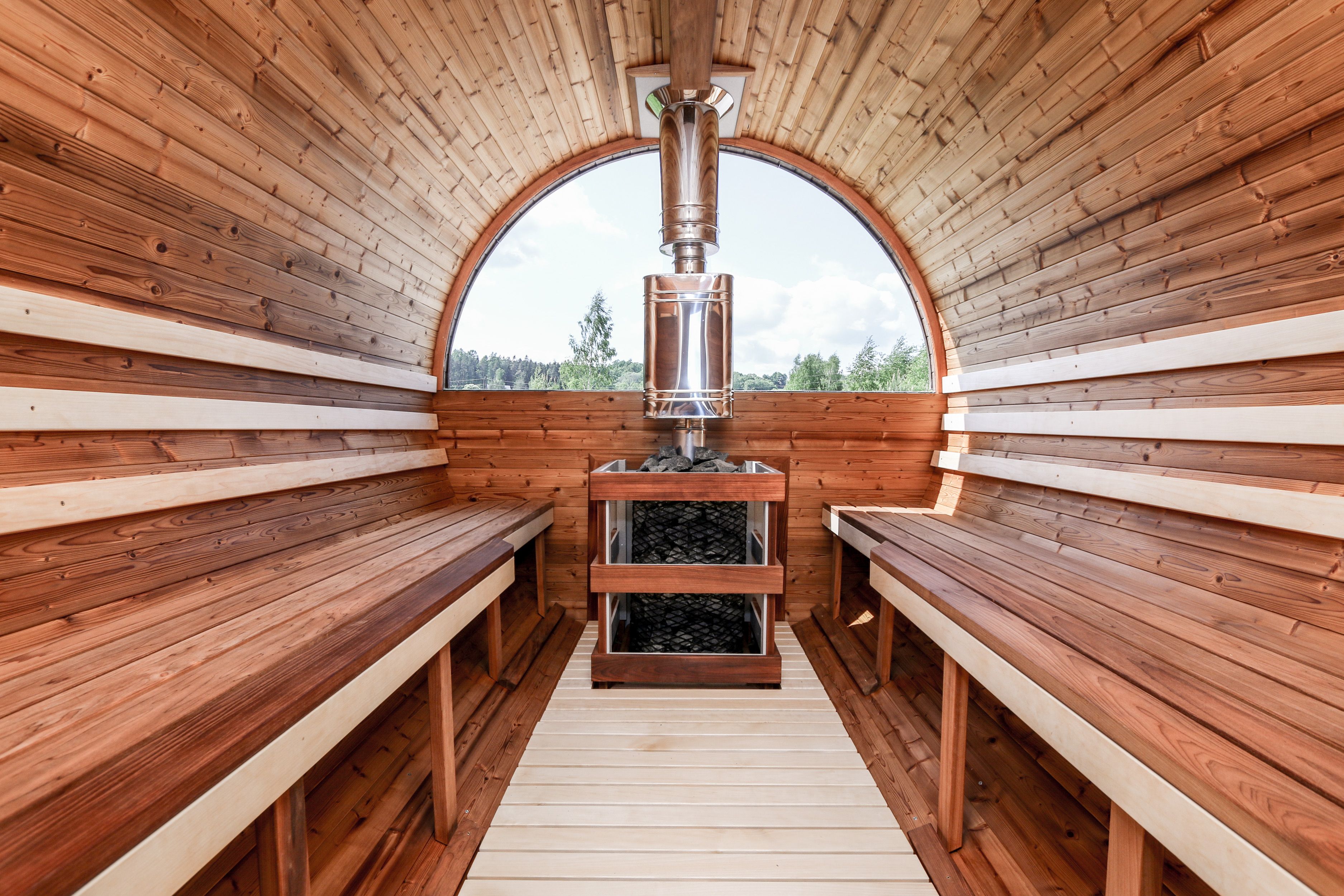 Это прямоугольное изделие с закругленными углами. За счет такой конструкции во время топки воздух циркулирует по кругу, поэтому баня-бочка нагревается не более 30 минут. Баня включает в себя раздевалку и парилку. Лавочки из кедра установлены по всей длине бани-бочки с обеих сторон. Печь расположена в парилке около дальней стены. Для удобства пользования в раздевалке находится вешалка и полочка из кедра. По вашему желанию баню-бочку квадро можно укомплектовать козырьком, верандой и печью с внешней загрузкой, благодаря которой весь мусор после топки остается на улице. Баня-бочка квадро не требует полноценный фундамент, поэтому при необходимости ее можно перенести в другое место.