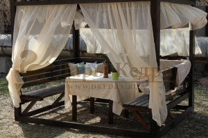 Беседка выполнена из кедра. На крыше - ондулин. Конструкция отличается простотой в установке, легкостью, долговечностью, прочностью и классическим дизайном, который впишется в любой интерьер приусадебного участка. Вокруг неё можно организовать ландшафт из вьющихся растений, которые красиво создадут зеленые "стены" снаружи и уют внутри.