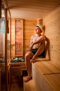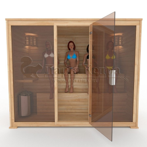 Это специально оборудованная готовая деревянная кабина для сухого и влажного парения. Электропечь нагревает пространство внутри и позволяет сбрызгивать камни водой, слегка увлажняя воздух. Такая процедура позволяет избежать перегрева. Сауна обшита снаружи и внутри кедровой вагонкой и имеет теплоизоляционный слой. Финская сауна с электропечью подойдет, как для домашнего использования, так и для коммерции. Доставляется в разборном виде щитами, собирается по инструкции с помощью шуруповёрта.