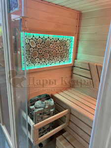 Это специально оборудованная готовая деревянная кабина для сухого и влажного парения. Электропечь нагревает пространство внутри и позволяет сбрызгивать камни водой, слегка увлажняя воздух. Такая процедура позволяет избежать перегрева. Каркас сауны выполнен из массива кедра, снаружи и внутри обшит липовой вагонкой сорта «Экстра» и имеет теплоизоляционный слой. Также двухуровневый полок идёт из кедра для обогащения внутри кабины полезными фитонцидами, а в сочетании с противовирусными свойствами липы сауна становится настоящим источником здоровья.