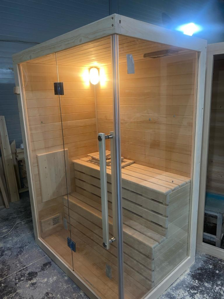 Закаленный цельностеклянный фасад с безрамной дверью является термостойким и придает конструкции легкость и обзорность. Можно добавить боковую стенку, как на образце 3D модели из термостекла за дополнительную плату. Дополнив кабину панелью из гималайской соли или можжевеловым панно с подсветкой вы получаете красивейший объект в интерьере. Финская сауна с электропечью подойдет, как для домашнего использования, так и для коммерции. Доставляется в разборном виде щитами, собирается по инструкции с помощью шуруповёрта.