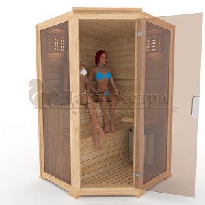 Это специально оборудованная деревянная кабина для сухого и влажного парения. Электропечь нагревает пространство внутри и позволяет сбрызгивать камни водой, слегка увлажняя воздух. Такая процедура позволяет избежать перегрева. Сауна обшита снаружи и внутри вагонкой из липы и имеет теплоизоляционный слой. Установка сауны в угол позволяет рационально использовать пространство помещения. Финская сауна с электропечью подойдет как для домашнего использования, так и для коммерции. Доставляется в разборном виде щитами, собирается по инструкции с помощью шуруповёрта.