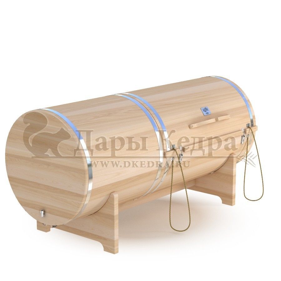 Фитобочка горизонтальная из кедра наиболее комфортна в использовании, потому что во время процедур человек принимает лежачее положение. Она оснащена откидной дверцей, которая во время открывания хорошо держится за счет джутовых веревок. Внутренняя ручка из кедра облегчает открывание и закрывании двери во время использования. Такая модель подходит для оздоровительных центров.