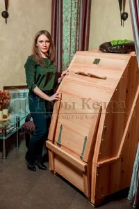 Квадратная фитобочка из кедра - это мини парная, которую можно использовать не только в спа-салонах, но и дома. Толщина стенок составляет 40-45 мм, что позволяет увеличить срок службы изделия. Откидная дверь бочки во время открывания фиксируется внешней подставкой - опорой, которая в закрытом состоянии складывается и не занимает лишнее пространство. Во время парения человек сидит внутри кедровой бочки, а голова находится снаружи. Благодаря этому исключается возможность перегрева. Встроенная ручка из кедра на двери делает эксплуатацию фитобочки более удобной.
