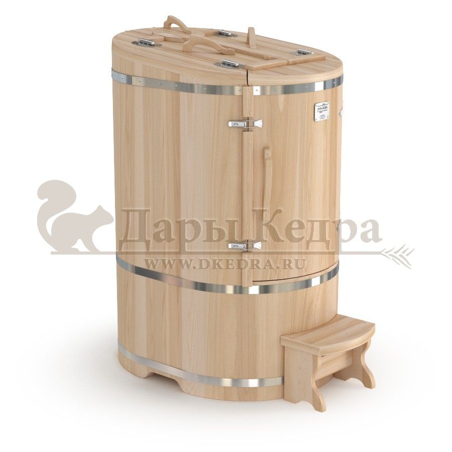 Овальная фитобочка из кедра - это мини парная, которую можно использовать не только в спа-салонах, но и дома. Овальная модель более просторна и удобна в использовании. Толщина стенок составляет 25 мм. Верхний скос делает положение головы более комфортным и улучшает обзор. Она оборудована откидными створками, дверцей и отверстием для головы. Во время парения человек сидит внутри кедровой бочки, а голова находится снаружи. Благодаря этому исключается возможность перегрева. Подлокотники из кедра, встроенные ручки на створках и двери делают эксплуатацию более удобной.