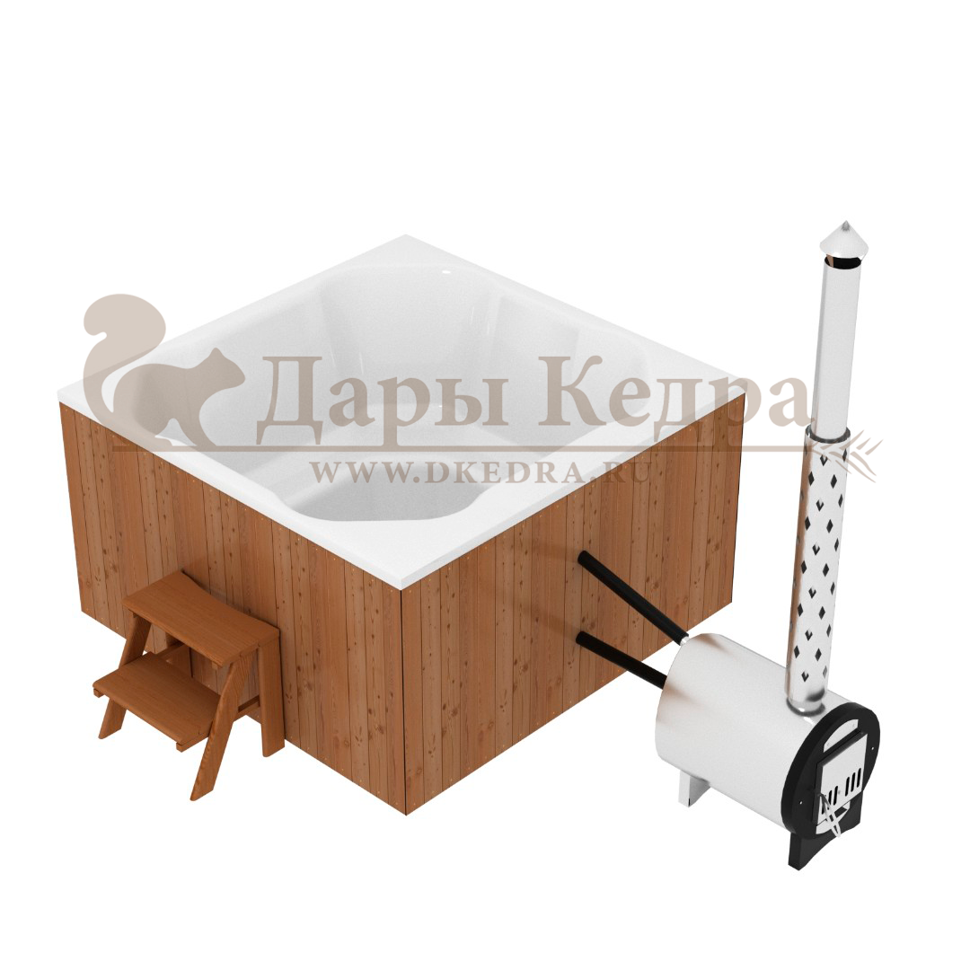 • Финская квадратная композитная купель с подогревом (с интегрированной печкой) «кварта интегра 200» Это уличная подогреваемая купель с квадратной внутренней чашей, которая изготовлена из современного прочного и термоустойчивого материала (композита). Форма чаши обеспечивает комфортную посадку во время принятия процедур. Для удобства пользования купель фурако оборудована приставной лестницей. Нагрев воды происходит за счет интегрированной печи, которая встроена под чашу. Композитная вставка придает купели красивый внешний вид, продлевает срок службы и облегчает уход за изделием. Парение на свежем воздухе – это отличный способ укрепить здоровье и поддержать организм в тонусе.