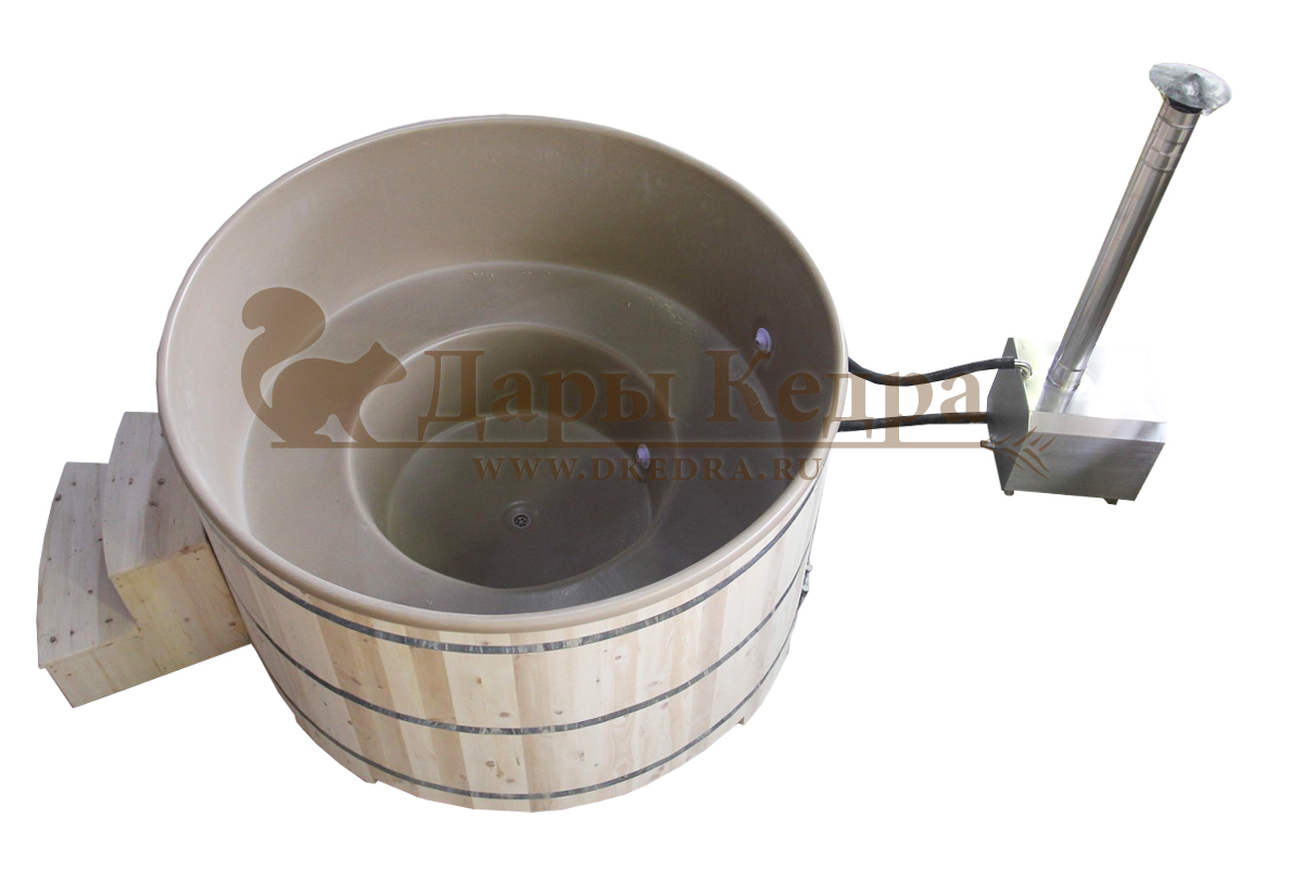 • Фурако круглая из кедра с литой термопластиковой вставкой с внешней печью Это уличная подогреваемая купель с круглой внутренней чашей из термопластика, которая имеет цельную форму вместе с сиденьями и дном. Для удобства пользования купель фурако оборудована приставной лестницей. Подогрев воды осуществляется за счет внешней печи с дымоходом. Термопластик устойчив к воздействию температур, облегчает уход за фурако и увеличивает срок ее службы. Парение на свежем воздухе – это отличный способ укрепить здоровье и поддержать организм в тонусе.