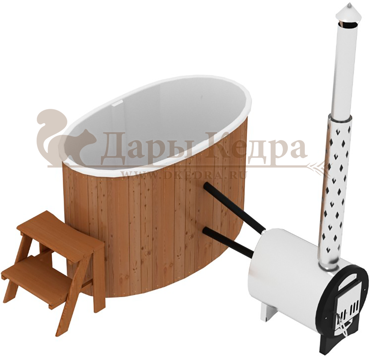 • Фурако овальная из кедра с внешней печью Это уличная баня, которой можно пользоваться круглый год. Купель представляет собой овальную емкость для воды, внутри которой располагаются сиденья из кедра. Подогрев воды осуществляется за счёт внешней печи с дымоходом, которая подключается с помощью шлангов с выходом внутри термостойких форсунок. Для удобства пользования японская баня фурако оборудована внешней и внутренней лестницей из кедра. Целебная древесина кедра богата фитонцидами и эфирными маслами, которые активируются при нагревании. Таким образом, во время процедур парения организм насыщается полезными веществами.