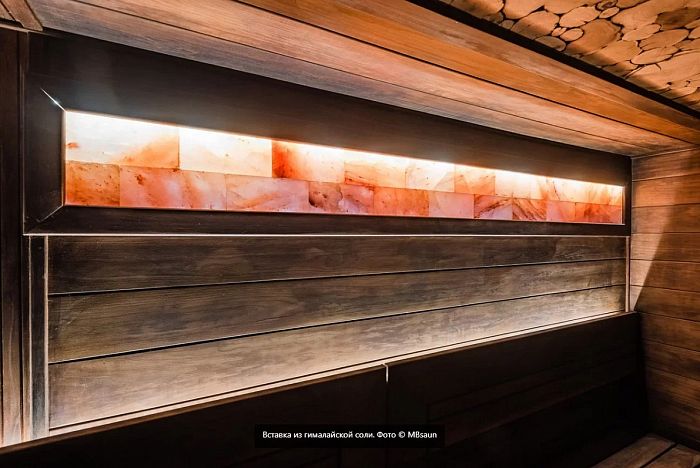 По сути, это обыкновенная поваренная соль, но по своему минеральному составу она обладает широким спектром полезных свойств. В её состав входят железо (розовый оттенок), марганец, магний, фтор и многие другие компоненты — всего около 80 наименований. Даже небольшая вставка из 10 плиток такой соли в сауне при нагревании создает микроклимат, схожий с соляной пещерой. Причем, стоит обратить внимание, что подобные панели с гималайской солью хорошо подходят для сухих финских парилок, где влажность помещения небольшая. Во влажной парной русской бани такие плитки гималайской соли постепенно расстают, вытекут, так как влага вымывает кристаллики соли. Перегородки из соляных плиток между парной и помывочным помещением устанавливать не стоит, так как со временем придется их постоянно ремонтировать и менять плитки.
