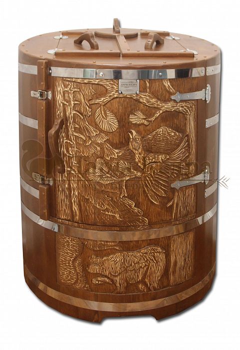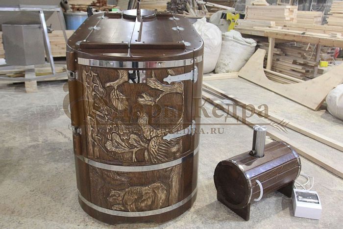 И, конечно, стоит отметить мастеров компании, осуществляющих профессиональную резьбу на древесине фитобочки или купели. Изделие с художественным оформлением - это выбор ценителей красоты, индивидуальности, эко-стиля. Бочка с резьбой станет объектом всеобщего внимания. Можно выполнить тонирование рисунка или окрашивание всей бочки в круговую и выделение рисунка сделать отдельно с помощью осветления. Таким образом, более светлый контур резьбы будет смотреться очень ярко на темной фитобочке. Все работы по художественному оформлению проводятся мастерами вручную, никаких станков!